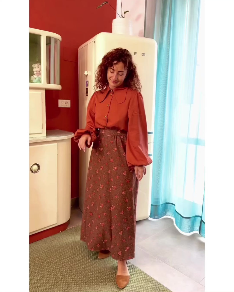 È quella camicia che indossi quando vuoi sentirti più coraggiosa del solito, come se avessi catturato l'energia di un tramonto infuocato e l'avessi trasformata nel tuo alleato quotidiano. Il tencel non è solo una fibra sostenibile: è una vera esperienza tattile. Immagina la freschezza della seta abbinata alla praticità del cotone, ma con una caduta ancora più bella. Questo tessuto intelligente si adatta alla tua temperatura corporea, lasciandoti respirare quando hai caldo e creando un microclima perfetto quando fa fresco. Il colletto tondo e importante crea un punto focale che incornicia il viso con carattere. Le maniche balloon aggiungono quella dose di teatralità bon-ton che trasforma una camicia semplice in un pezzo speciale.