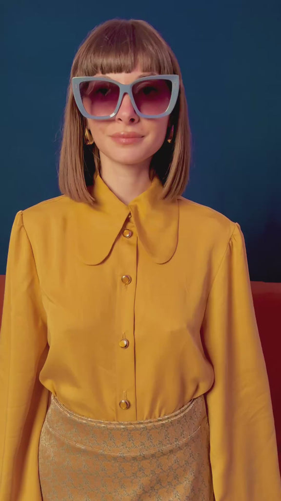 La base dorata calda e avvolgente fa da tela a una danza di piccoli fiori che catturano la luce in modo diverso a ogni movimento. Il tessuto ha corpo e struttura, quella consistenza ricca che si sente al tatto e che dona alla gonna una caduta impeccabile, quasi scultorea. Taglio svasato, con vita alta che definisce il punto più stretto della silhouette e chiusura laterale invisibile che mantiene la linea pulita e sofisticata. Il pattern floreale delicato su quella base dorata crea un effetto luminoso. Perfetta con la camicia Shirley ocra per un total look ton sur ton che gioca sulle texture, oppure con toni contrastanti per creare armonie cromatiche inaspettate. Funziona con collant coprenti e stivaletti per l'autunno, o con le gambe nude e sabot quando le giornate sono più miti. È la gonna che trasforma un aperitivo in un evento, una cena in un ricordo.